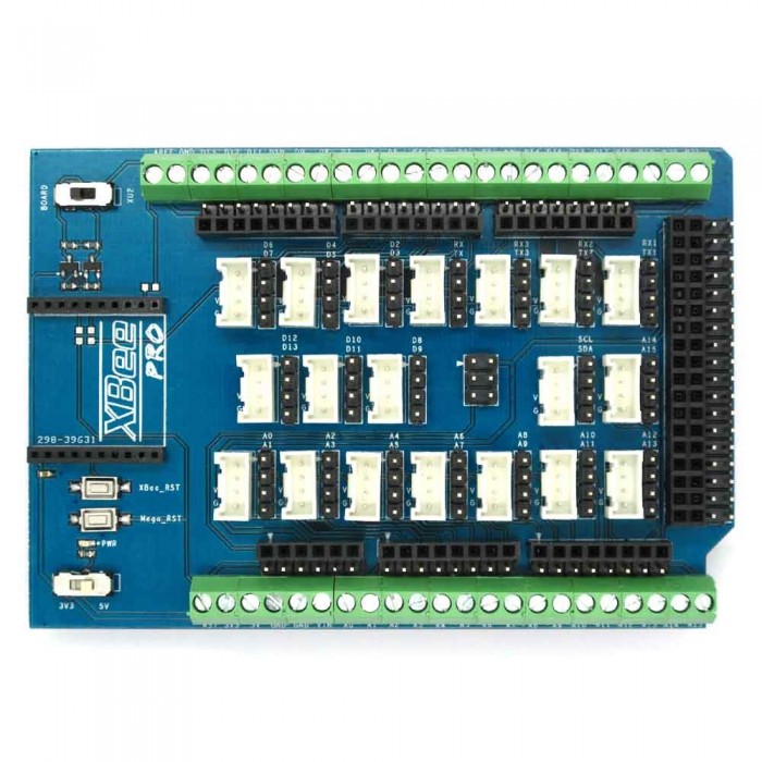 Mega Shield vis Proto connecte toutes les broches de l'Arduino Mega 2560 et certains des broches sont étendues aux bornes à vis 3,5 mm d'espacement. En outre, il est équipé de 4 broches bosquet interface brique électronique ainsi que l'interface XBee pour les broches D0 ~ 21 et A0 ~ 15, qui est d'une grande aide pour la conception de notre carte de développement. Aussi, shield dispose d'un commutateur de niveau, ce qui est compatible avec les cartes mères de niveau d'exploitation de 3,3 V comme Arduino DUE.