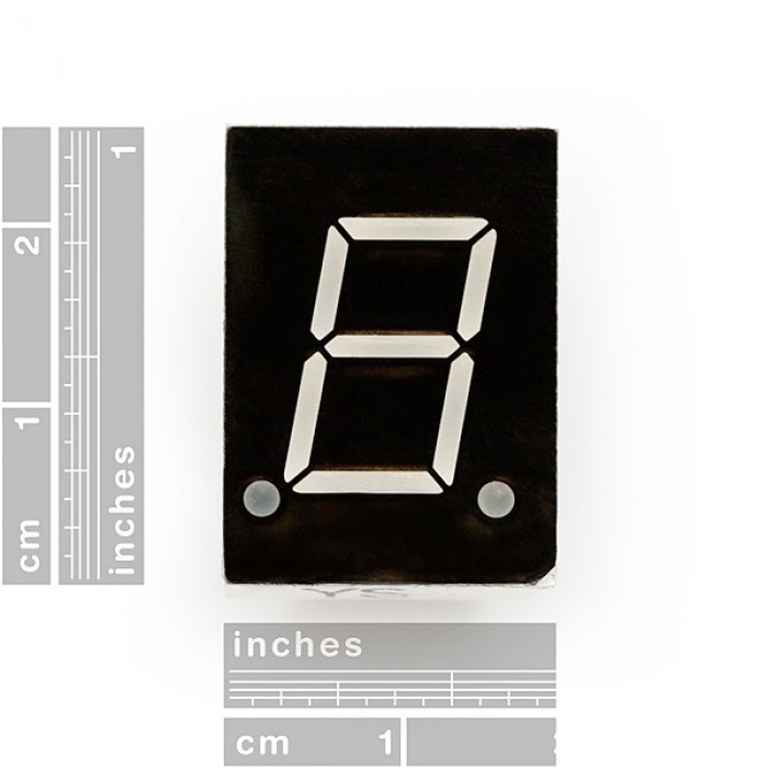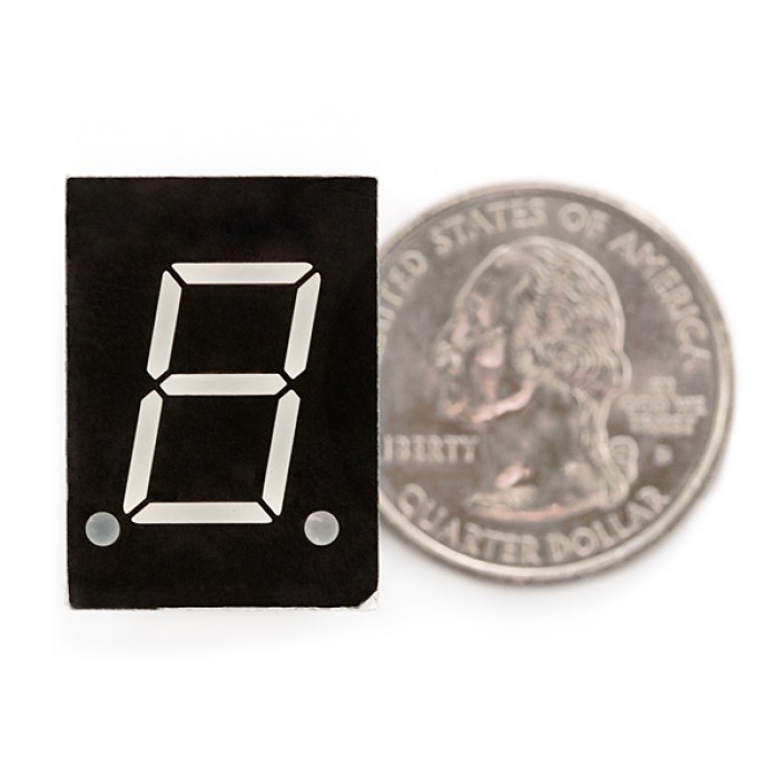 Your basic 7-segment LED. Common anode. Two decimal points, but only the one on the right is wired. Digit height is 0.6". Overall height is 1"