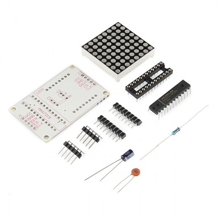 Do you like LED matrices? We do! Now we are giving you the power to make your own with minimal soldering any beginner can perform and give you a great introduction to programming an LED Matrix. This kit will show you how to use the MAX7219 to interface Arduino to easily drive an 8X8 LED matrix.