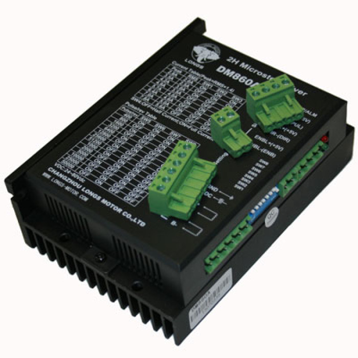 DM860A is a type of two-phase hybrid stepping motor driver, The drive voltage of which is from 24VDC to 80VDC. It is designed for use with 2-phase hybrid stepper motor of all kinds with 57mm to 110mm outside diameter and less than 8.0A phase current. This circuit that it adopts is similar to the circuit of servo control which enables the motor run smoothly almost without noise and vibration. Hording torque when DM860A run under high speed is also significantly higher than the other two-phase driver, what’s more, the positioning accuracy is also higher. It is widely used in middle and big size numerical control devices such as curving machine, CNC machine, and computer embroider machine, packing machines and so on.