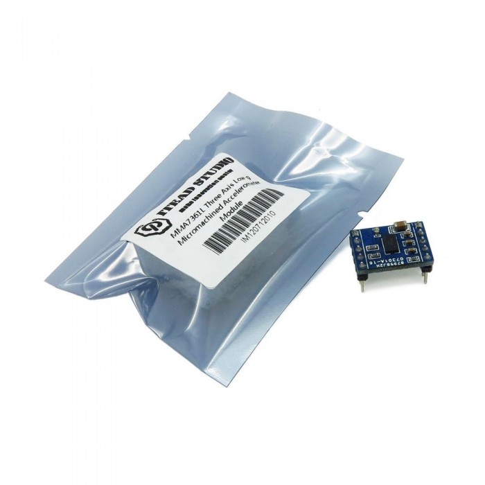 This is a breakout board for Freescale's MMA7361L three-axis analog accelerometer. The sensor requires a very low amount of power and has a g-select input which switches the accelerometer between ±1.5g and ±6g measurement ranges. Other features include a sleep mode, signal conditioning, a 1-pole low pass filter, temperature compensation, self test, and 0g-detect which detects linear freefall. Zero-g offset and sensitivity are factory set and require no external devices.