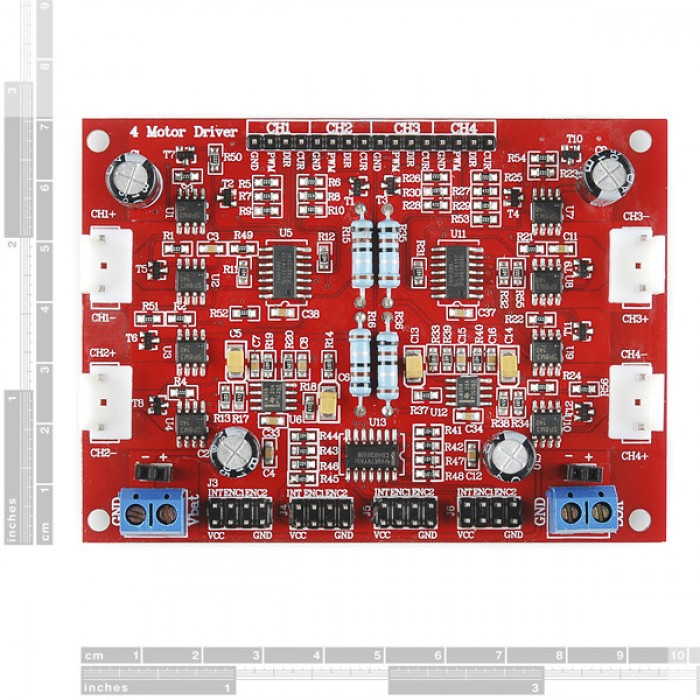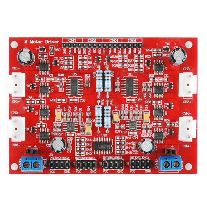 This motor driver board, originally designed by Dagu for their Rover 5 platform, is ideal for any small 4-wheel drive robotic vehicle. With four motor outputs, four encoder inputs and current sensing for each motor, it's a must-have when implementing omni or mechanum wheels.