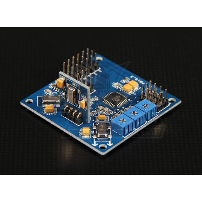 The HobbyKing Multi-Rotor controller is a flight control board for multi-rotor Aircraft (Tricopters, Quadcopters, Hexcopters). Its purpose is to stabilise the aircraft during flight. To do this it takes the signal from the three on board gyros (roll, pitch and yaw) then passes the signal to the Atmega328PA IC. The Atmega328PA IC unit then processes these signals according the users installed software and passes control signals to the installed Electronic Speed Controllers (ESCs). These signals instruct the ESCs to make fine adjustments to the motors rotational speed which in turn stabilises your multi-rotor craft.