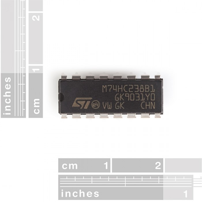 Le M74HC238 est un CMOS de 3 à 8 décodeur de ligne à grande vitesse. Il ya trois entrées de sélection binaires (A, B, et C) qui déterminent où l'un des huit sorties (Y0-Y7) augmente. Cette puce dispose de trois entrées permettent (G1, ~ G2A et G2B ~); quand tout permettre broches sont abaissés (ou grande dans le cas de G1), toutes les broches de sortie sont tirés bas.