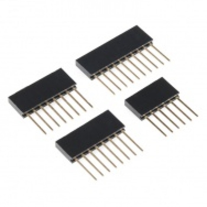 These headers are made to work with the Arduino Uno R3, Leonardo and new Arduino boards going forward. They are the perfect height for clearing the USB-B connector and great for stacking multiple shields. This kit includes 4 headers (2 8-pin, 1 10-pin and 1 6-pin), enough to connect a shield to an Arduino board. These are the same headers we use in our tutorials and with our own.
