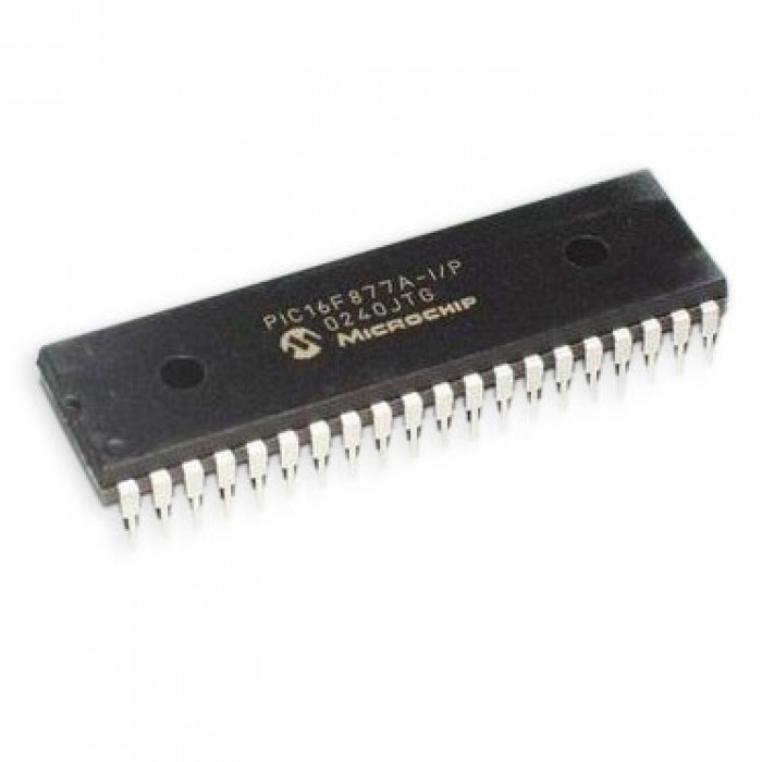 Microchip's 16F877A 8-Bit Processor. 8K of program space and 33 I/O lines, 8 of which are 10bit Analog to Digital converter capable. Runs up to 20MHz with external crystal. Package can be programmed in circuit.