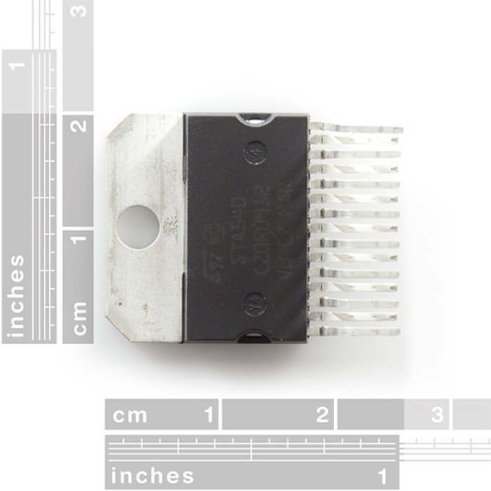 Cette puce est livré dans un quinconce de plomb Multiwatt-15 paquet. Alors que notre conseil d'évasion pour le L298N n'est pas conçu pour cela précisément, il breakout toutes les broches de la STA540 à une rangée plus standard de 0,1 "en-têtes de hauteur. Aussi, gardez un œil sur les quelques prochains produits d'amplification sur la base de ce puce!