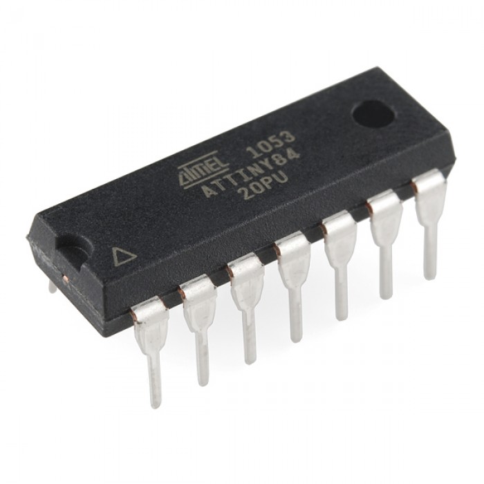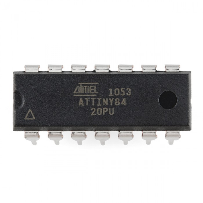 The ATtiny84 is another of Atmel's little tiny 8-Bit Processors. 8K of program space, 12 I/O lines, and 8-channel 10 bit ADC. It will run up to 20MHz with an external crystal and can be programmed in circu