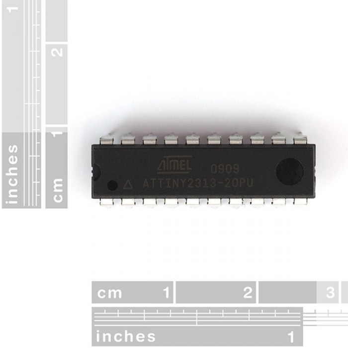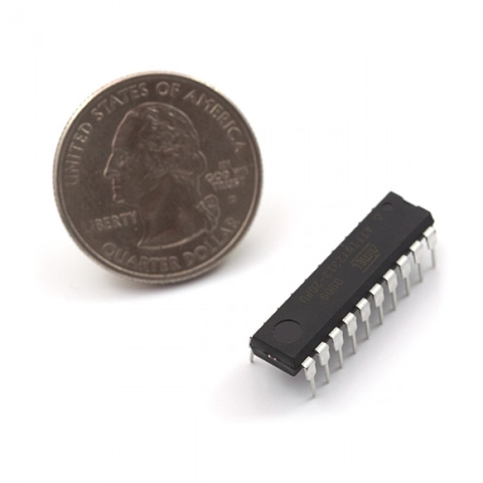 Atmel's ATtiny2313 8-Bit Processor. 2K of program space and 15 I/O lines. UART compatible pins. Runs up to 20MHz with external crystal. Package can be programmed in circuit.