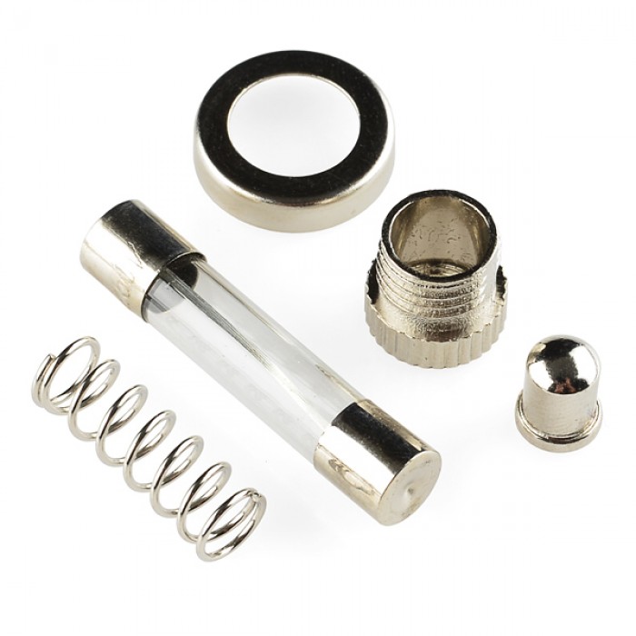 This 12V car adapter jack allows you to plug your project into your car's cigarette lighter for power on the go. It includes the housing, fuse, spring-loaded center pin, and even a red LED to indicate power status. Wires are connected with solder tabs inside the housing.