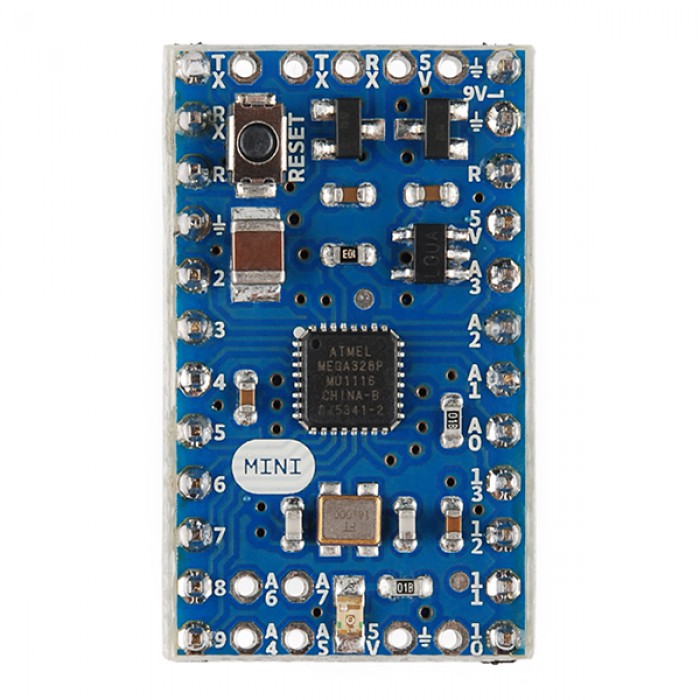 L'Arduino Mini dispose de 14 entrées/sorties digitales - dont 6 peuvent être utilisés en sorties PWM (modulation de largeur d'impulsion) - 8 entrées analogiques et un cristal externe 16 Mhz.