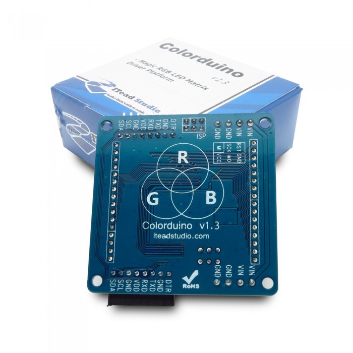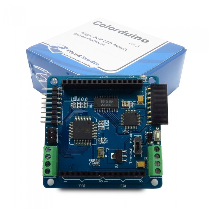 Colorsduino is a magic RGB LED dot-matrix driver compatible with Arduino . Colorsduino pairs the M54564 with a single DM163 constant current driver. By using the DM163, Colorduino gains three 8+6-bit channels of hardware PWM control of the LED’s freeing up the MCU from having to implement it in software. This gives the ATmega328 more CPU bandwidth for performing other tasks. Colorduino is easy to cascade by IIC and Power interface.