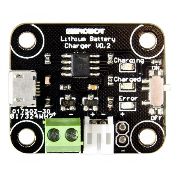 The board incorporates a charging circuit, status LED, connector for your battery (JST-type used in the batteries we carry), and a micro-USB connector. Four small mounting holes allows this charger to be easily embedded into a project.