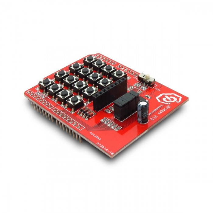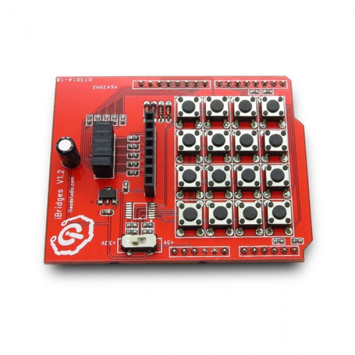 IBridge is a 4X4 key-pad shield with a 5110 Graphic LCD interface.You can plug it on Arduino boards directly, and you can get the small development platform with keypad input and Graphic LCD display.