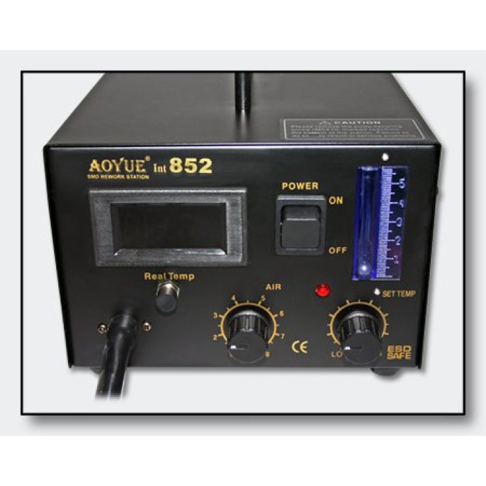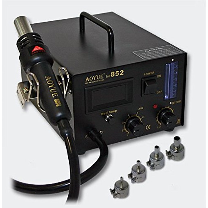La station de soudage idéale. L'appareil pour tout laboratoire ou atelier. Il s'agit d'une station à air chaud haute technologie pour réparation de CMS du fabricant Aoyue. Le modèle 852 est particulièrement bien maniable et facile à l'emploi!! La température est affichée sur écran numérique et peut être rectifiée et ajustée par des boutons rotatifs. Le flux d'air est visualisé par un débitmètre à billes métalliques. Le corps est peint en noir et muni d'un support pratique dans lequel on peut mettre la poignée. Même si vous n'êtes pas professionnel vous pouvez en quelques minutes vous servir de l'appareil. Vous recevrez à l'achat de cet appareil quatre buses différentes, un appareil pour soulever les composants avec crochet de rechange pour que vous puissiez continuer de travailler SANS coûts supplémentaires.