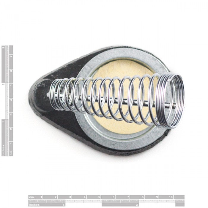 This is a simple soldering iron stand composed of a heavy-duty metal base and a reinforced spring holder. The base and holder are detachable. A circular cleaning sponge, which has a nice home at the bottom of the base, is included.
